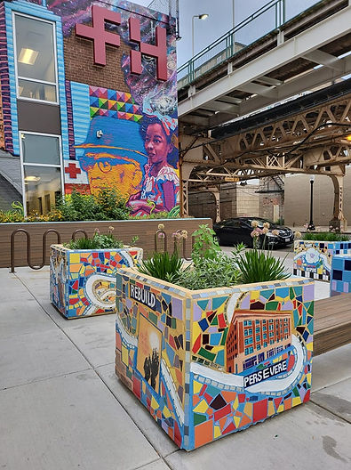 Leading up to the entrance of the Friends Health Center at 63rd and Cottage Grove by Pugs Atomz and Damon Lamar Reed. Our collaboration consisted of a series of brightly colored mosaic planters depicting keywords and imagery from neighbors, symbolizing the importance of history, resiliency and strength in the Woodlawn community over the years. We did this project in partnership with Chicago Public Art Group.